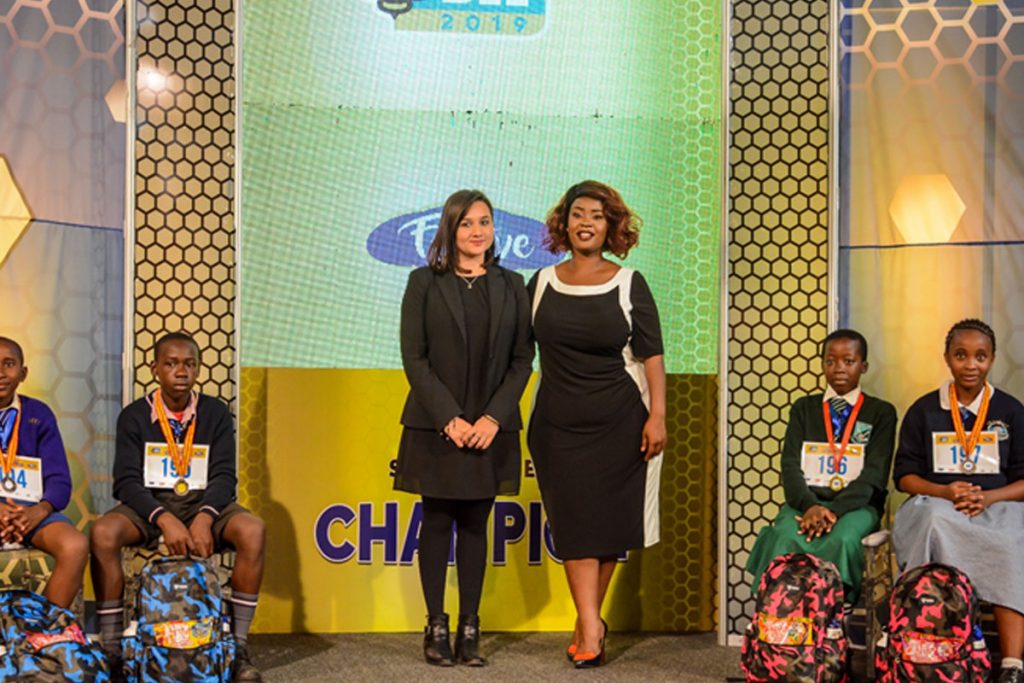 Nazia Hussein poses for a photo with host Kalekye Mumo and some of the 2019 spellers.